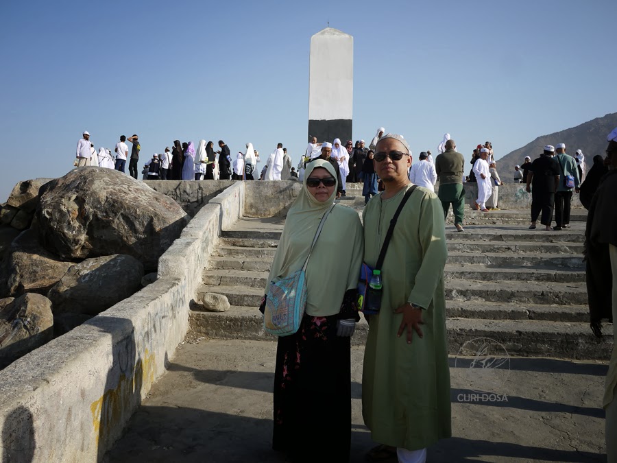 ▲ myQueen and me, Jabal Rahmah. Mount Arafat or Mount Arafah (Arabic: جبل عرفات; transliterated Jabal ‘Arafāt) is a granite hill east of Mecca. It is also known as the Mount of Mercy (Jabal ar-Rahmah). According to Islamic tradition, the hill is the place where the Islamic prophet Muhammad stood and delivered the Farewell Sermon to the Muslims who had accompanied him for the Hajj towards the end of his life. It reaches about 70 m in height. ©2013 WakGelas™